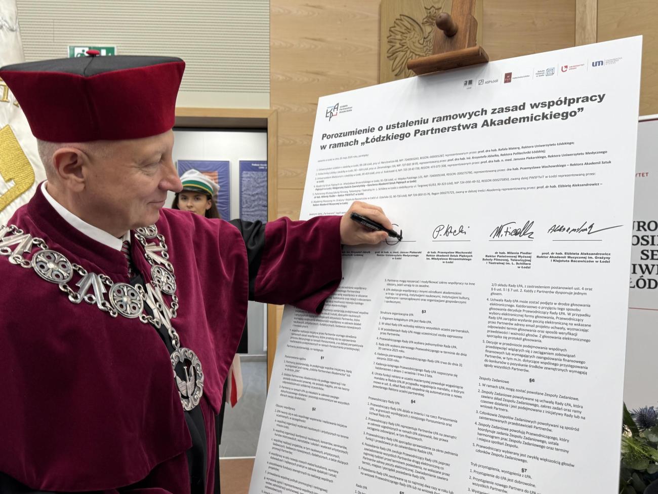 Na uroczystym posiedzeniu Senatu Uniwersytetu Łódzkiego (26 maja 2025 r.), Rektorzy uczelni publicznych podpisali Porozumienie o ustaleniu ramowych zasad współpracy w ramach „Łódzkiego Partnerstwa Akademickiego”, których efektem będzie wspólne wspieranie i realizacja inicjatyw uczelnianych m.in.